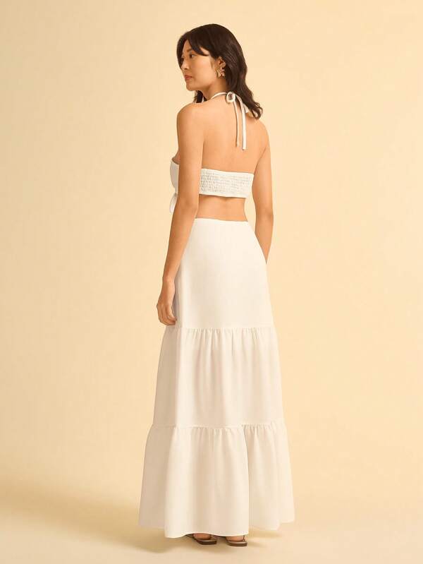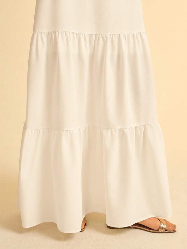 Este vestido largo blanco es el equilibrio perfecto entre elegancia y feminidad. Su diseño tipo A-line con tirantes tipo cami y cintura alta favorece la silueta, mientras que el dobladillo con vuelo (flounce) añade un toque romántico y sofisticado.