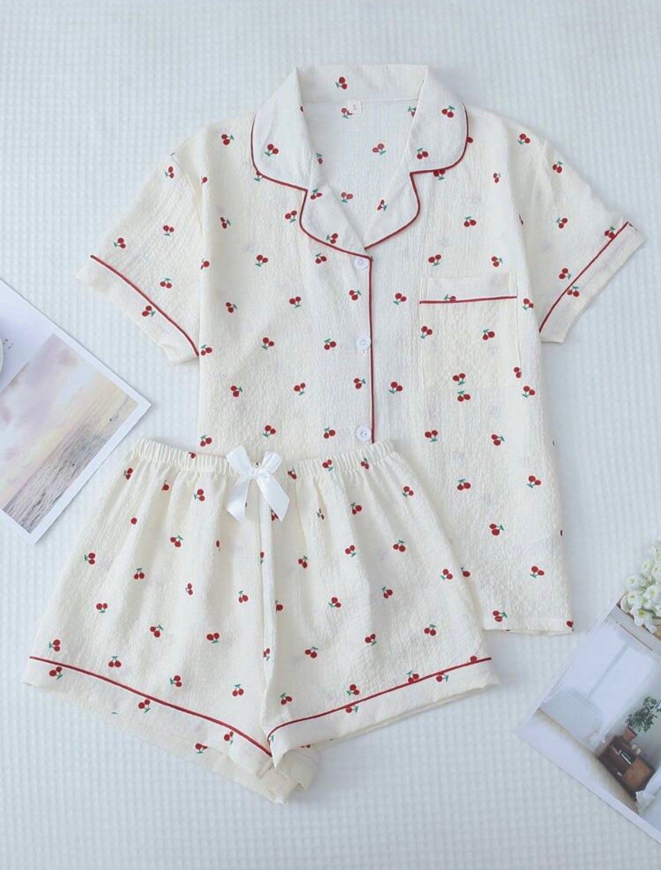 Este conjunto de de pijama de dos piezas de estilo casual-joven es perfecto para un look cómodo y fresco. Confeccionado en tela tejida con ligera elasticidad, está compuesto por un top de manga corta con cuello de solapa y un short, ambos con un ajuste holgado que brinda libertad de movimiento. Su estampado geométrico con cerezas le da un toque divertido y moderno.