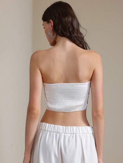 Este top sin mangas en color blanco es ideal para un estilo casual y fresco. Con un diseño strapless, presenta un atractivo detalle de cordones en la espalda que le da un toque único y coqueto, mientras que la cremallera asegura un ajuste perfecto. Su estampado floral y de letras en toda la prenda agrega un aire moderno y juvenil. El dobladillo asimétrico y el ajuste slim fit destacan tu figura de manera favorecedora, mientras que su largo crop lo hace perfecto para combinar con pantalones de tiro alto o faldas. Confeccionado en una mezcla de 95% poliéster y 5% elastano, el tejido ligeramente elástico ofrece comodidad y flexibilidad. No tiene forro, lo que mantiene su diseño ligero y fluido. Se recomienda lavarlo a mano y evitar el lavado en seco para preservar su calidad. Ideal para un look relajado y con estilo en días soleados o para una salida casual.