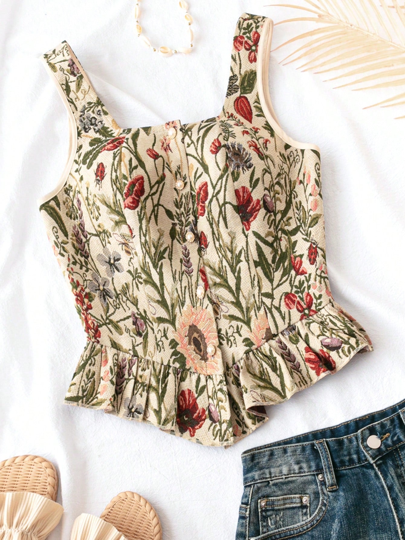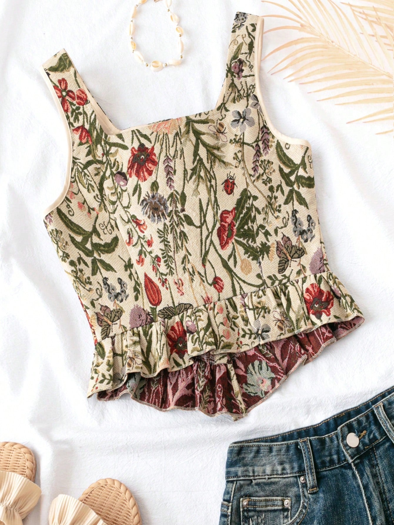 Este encantador top de estilo boho es perfecto para un look fresco y vibrante. Su diseño con escote cuadrado y tirantes realza la figura con un toque femenino y moderno. Con un estampado floral y de plantas en tonos multicolores, transmite un aire natural y relajado. El dobladillo con volantes y el corte asimétrico añaden movimiento y elegancia. Confeccionado en tejido ligero de 100% poliéster, es cómodo y fácil de cuidar, ya que se puede lavar a máquina o limpiar en seco. Ideal para combinar con faldas, shorts o jeans para un estilo bohemio y chic.