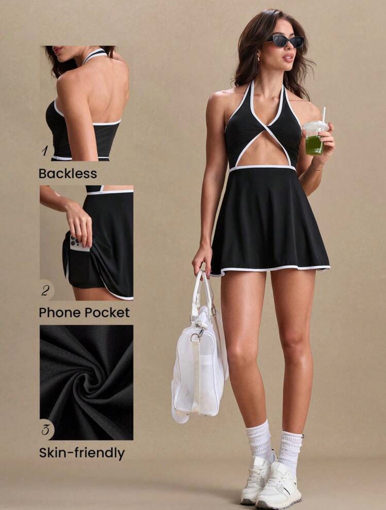 Conjunto deportivo ideal para tenis y golf, confeccionado en tejido de punto con 90% poliéster y 10% elastano. Diseño ajustado (slim fit) sin mangas y con escote en V. El vestido es corto (mini) y viene acompañado de shorts mini. Presenta detalles como cortes decorativos, ribetes en contraste y espalda descubierta. El diseño es a rayas y en bloques de color, en tonos blanco y negro. Tiene elasticidad media y no es transparente. No cuenta con forro térmico.