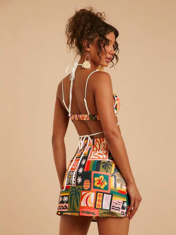 Conjunto playero de dos piezas con un estilo sexy y vibrante, compuesto por un top tipo camisilla corta con escote halter y espalda descubierta cruzada, y una falda corta a juego. Presenta un diseño multicolor con estampado tipo colorblock y motivos de plantas en toda la prenda, ideal para destacar en la playa. Hecho en tela tejida 100% poliéster, sin elasticidad ni forro, de ajuste regular y textura ligera. Es cómodo, fresco y no transparente. Recomendado para lavar a máquina con detergente suave (no limpieza en seco). Perfecto para un look veraniego atrevido y lleno de estilo.