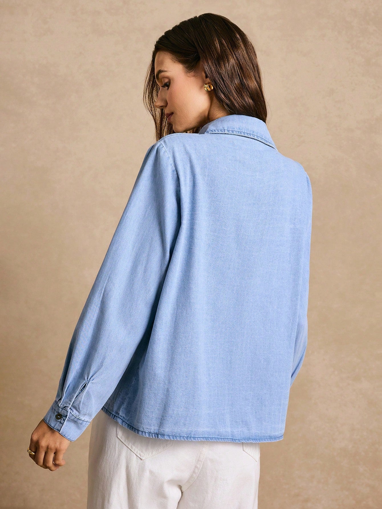 Añade un toque de estilo casual a tu look con esta camisa de mezclilla azul de ajuste holgado y cómodo. Su diseño presenta un cuello clásico, una solapa con botones y bordados de corazones, que le aportan un toque femenino y moderno.