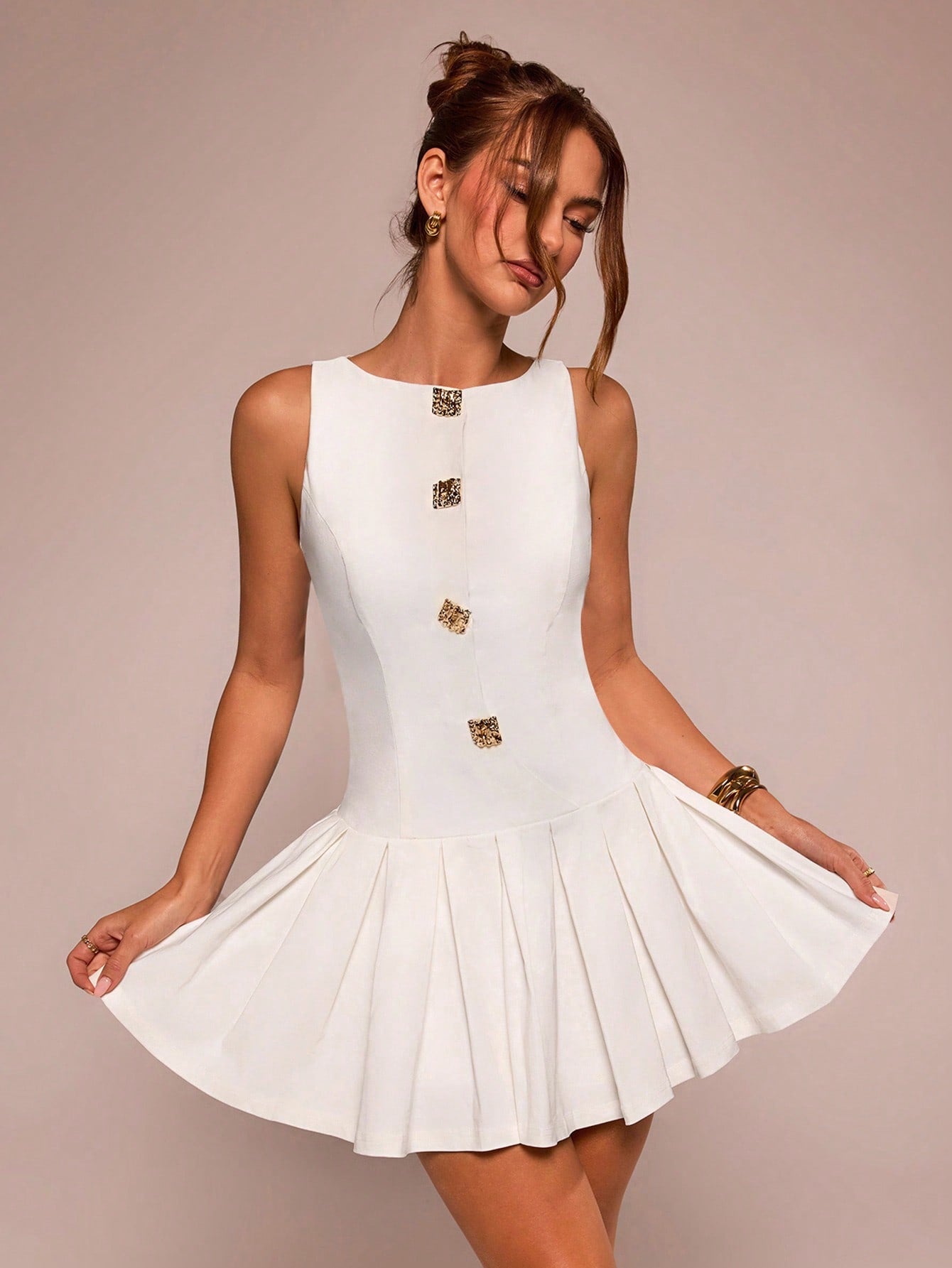 Este vestido blanco sin mangas combina elegancia y frescura, perfecto para ocasiones especiales o un look sofisticado. Su escote redondo y su corte ajustado en la parte superior estilizan la figura, mientras que la falda plisada con volante en el dobladillo añade un toque femenino y dinámico.
