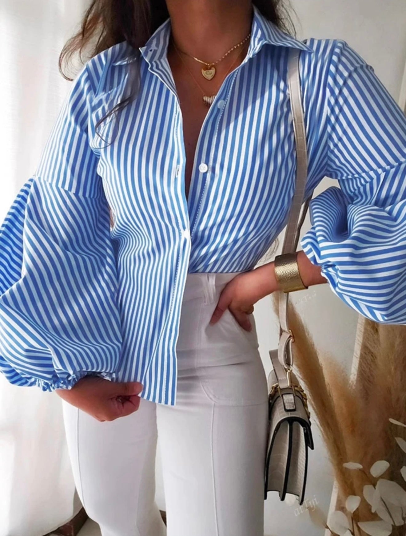 Esta camisa casual de manga larga es perfecta para un look relajado y elegante. Con un patrón a rayas y un cuello tipo camisa, ofrece un estilo clásico con un toque moderno. Las mangas de tipo obispo le añaden un aire bohemio, mientras que los botones frontales aportan un detalle sutil pero sofisticado. Fabricada en 100% poliéster, esta camisa tiene un ajuste suelto que te garantiza comodidad durante todo el día. Su dobladillo regular y su tela no elástica le dan una caída fluida y ligera. Aunque no está forrada, es ideal para usar en diversas estaciones del año. Además, es fácil de cuidar, ya que se puede lavar a máquina o limpiar en seco. ¡Una prenda versátil y moderna para tu armario!