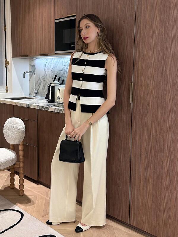 Blusa sin mangas de estilo casual con diseño moderno en rayas horizontales blanco y negro tipo colorblock, confeccionada en tela de viscosa 100% con elasticidad media que se adapta al cuerpo en un corte entallado (slim fit). Presenta escote redondo, botones decorativos dorados al frente y un detalle de abertura inferior que aporta un toque elegante y estilizado. Ideal para climas de primavera u otoño (18–25 °C), esta pieza no es transparente, no lleva forro y se recomienda lavar a mano o con limpieza profesional en seco. Perfecta para combinar con pantalones de talle alto o faldas para un look sofisticado de diario.