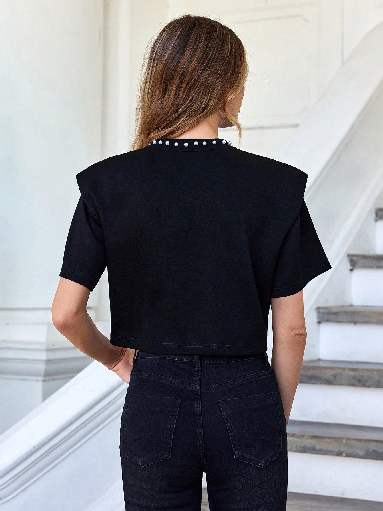 Esta elegante blusa negra de estilo casual combina comodidad y sofisticación. Con un diseño de cuello redondo y mangas cortas, su corte holgado y tela de alta elasticidad ofrecen un ajuste cómodo y moderno. Los detalles de perlas y cuentas añaden un toque de distinción, ideal para elevar cualquier look. Confeccionada en una suave mezcla de poliéster, viscosa y elastano, es fácil de cuidar y puede lavarse a máquina o limpiarse en seco. Perfecta para combinar con jeans, faldas o pantalones de vestir para un estilo versátil y chic.