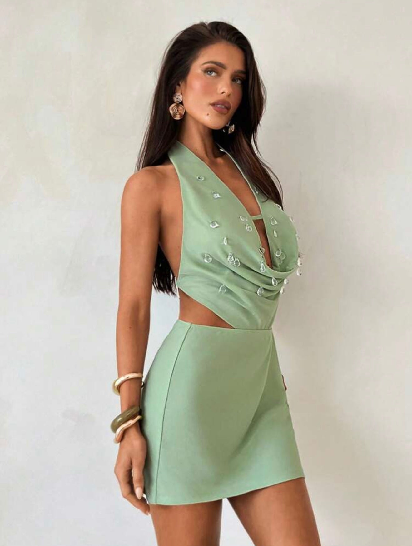 Vestido mini verde menta con diseño ajustado y escote halter, confeccionado en tela con lentejuelas que combina 94% poliamida y 6% elastano para un ligero estiramiento y un ajuste ceñido. Su estilo sin mangas, espalda descubierta, recortes decorativos y botones frontales aportan un toque sexy y sofisticado, ideal para fiestas, brunch, bodas o eventos especiales. Cuenta con forro interior de poliéster, cintura alta y bajo tipo lápiz que realzan la figura. Se recomienda lavar a mano y no usar limpieza en seco.