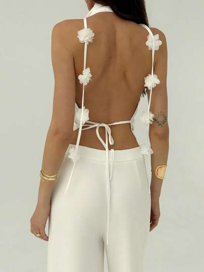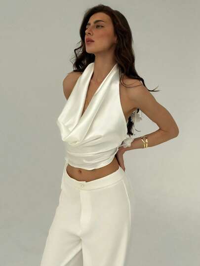 Este elegante y sensual top en color blanco es la elección perfecta para un look sofisticado y atrevido. Con un diseño sin mangas y un escote halter, su espalda descubierta y el detalle de nudo en el drapeado le dan un toque único y elegante. El dobladillo asimétrico agrega un estilo moderno y dinámico, mientras que el ajuste slim fit resalta la figura con un corte favorecedor. Confeccionado en satén de alta calidad, compuesto por 95% poliéster y 5% elastano, este top ofrece una caída suave y fluida. El material no es elástico, lo que asegura un ajuste ceñido y cómodo. No tiene forro, lo que resalta su diseño minimalista y elegante. Se recomienda lavarlo a máquina o llevarlo a la tintorería para un cuidado adecuado. Ideal para una noche especial o para un evento donde quieras impresionar con un look sexy y refinado.