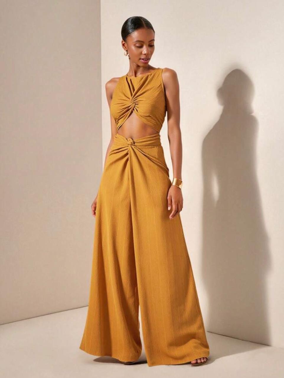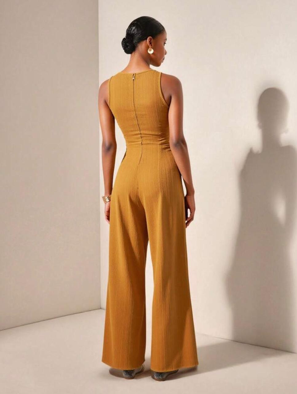 Luce elegante y sofisticada con este jumpsuit tipo unitard en color mostaza, diseñado con un escote redondo y una cintura alta, realza la silueta femenina con un ajuste tipo skinny que estiliza la figura.